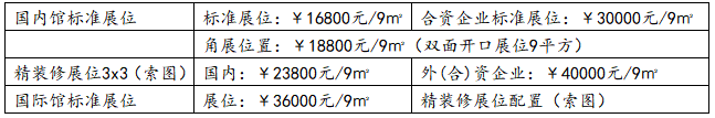 1、标准展位9m²(3m×3m);配置:展出场地、三面展板(高2.5m)、一块中英文楣板、一张洽谈桌、二把椅子、地毯、220V电源插座一个、二支射灯。