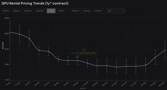 据半导体研究机构SemiAnalysis周四推出的“H100一年期租赁合约价格指数”,这款“老芯片”的租赁合约价格从2025年10月触及每小时1.7美元后,已经在今年3月飙升至每小时每块GPU 2.35美元,飙升近40%。