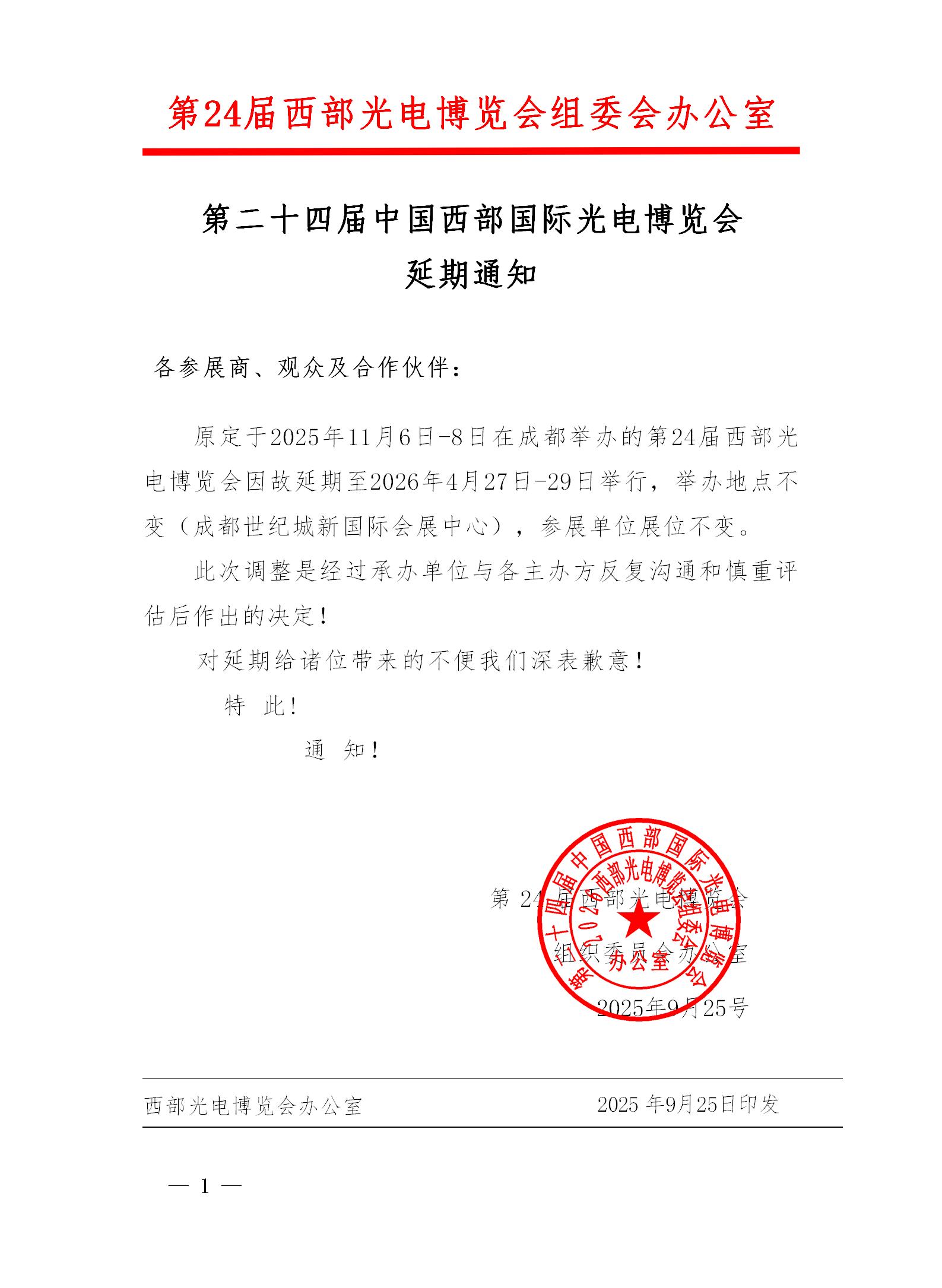第二十四届中国西部国际光电博览会延期通知