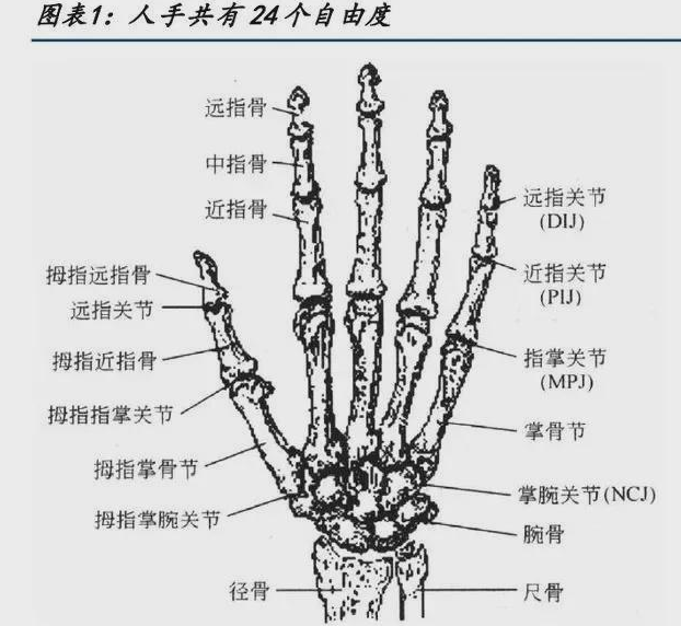人类灵巧手包括29个关节(图片来源:《机器人灵巧手——建模、规划与仿真》)