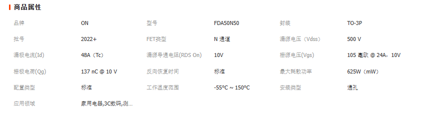 FDA50N50 ON TO-247 晶体管 通孔 N 通道 500 V 48A 场效应管
