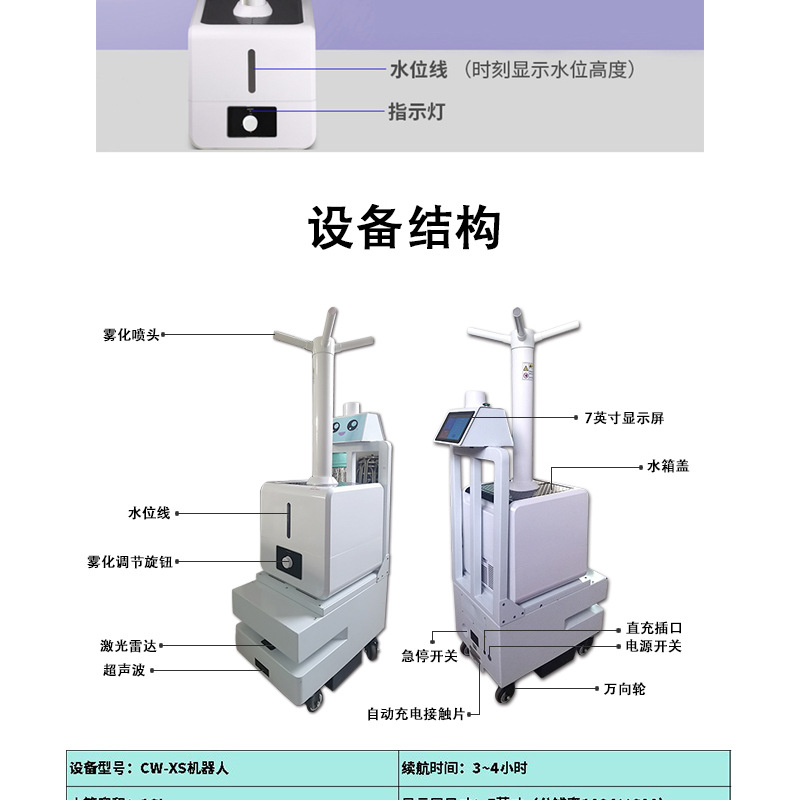 小闯智能雾化消杀机器人,智能消毒模式,多种消毒液可用,大量出雾,移动多点消毒,超大水箱,消毒更持久,自动返回充电,智能避障,自动消毒免人工操作,减少人员接触,解放双手,缓解用工紧张,节省时间节省成本,方便快捷,操作简单,使用方便,适用于医院、企业办公场所、商场、车站、机场、会所等场所。